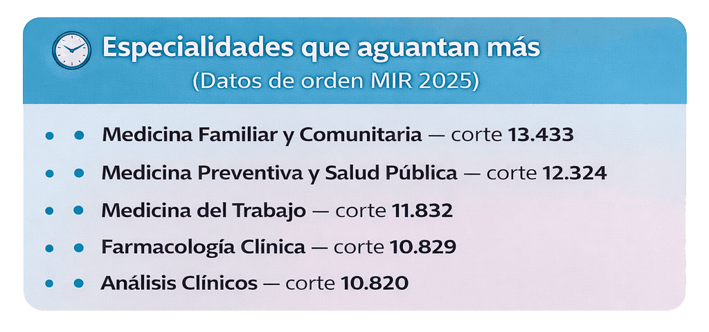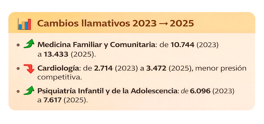 - Medicina Familiar y Comunitaria: pasa de 10.744 (2023) a 13.433 (2025), ampliando mucho su rango de elección.